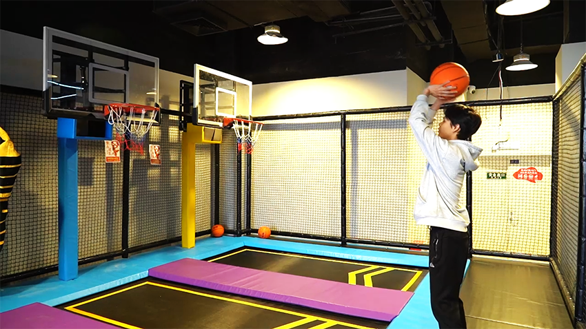 在蹦床上跳躍,以完成傳球、投籃等動作,可以鍛煉身體素質和協調能力,具有很強的趣味性和觀賞性。